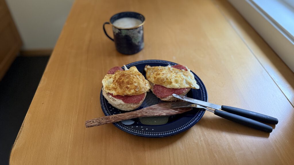 Denn Dill schiebe ich zur Seite, ansonsten ganz gut. Die Waffel ist leider nicht so fluffig wie die Waffel, Die wir mit meinem Tefal Waffeleisen machen, aber hey, in Deutschland sitze ich auch nicht an einem Fjord. Man kann also nicht alles haben.