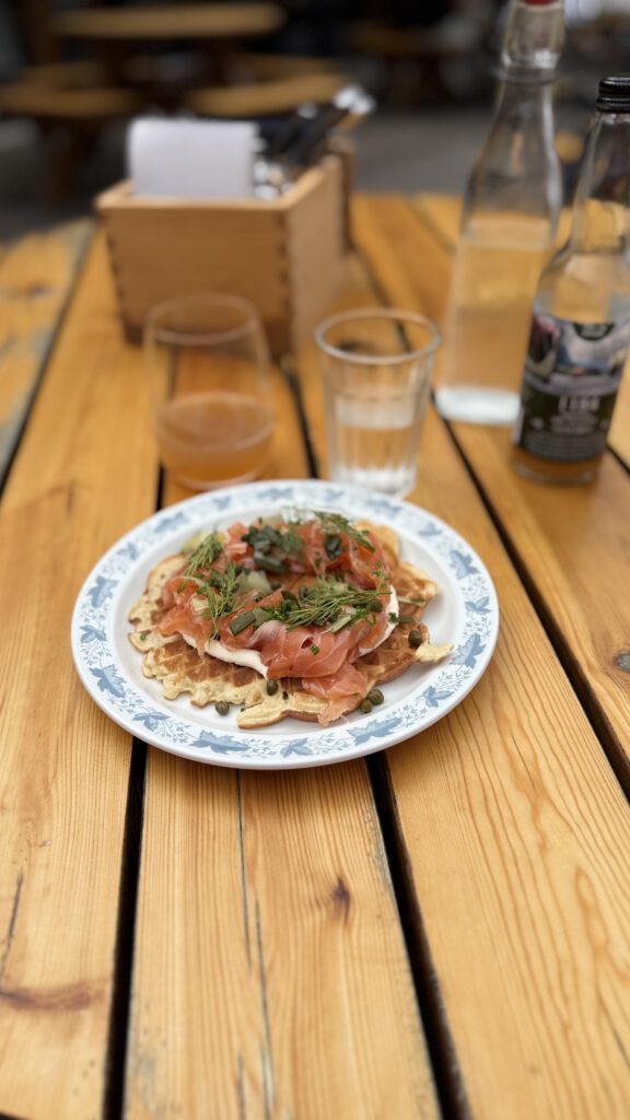 Ich geniesse den Ausblick und bestelle eine herzhafte Waffel mit Smør und Lachs.