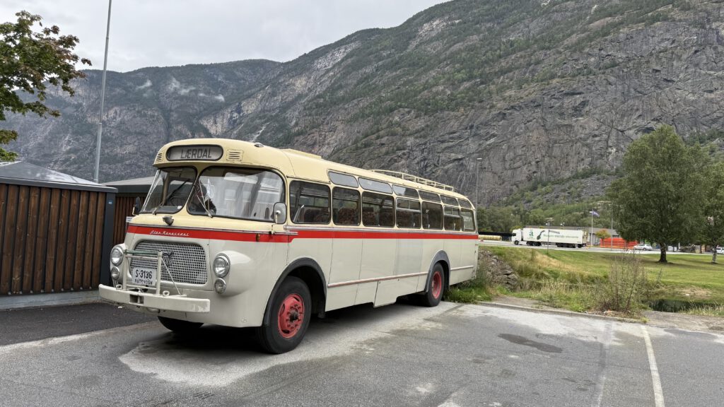 Der Bus ist ein Volvo und hat bestimmt in den fünfziger sechziger Jahren schon Touris über die Fjord Straßen befördert…
